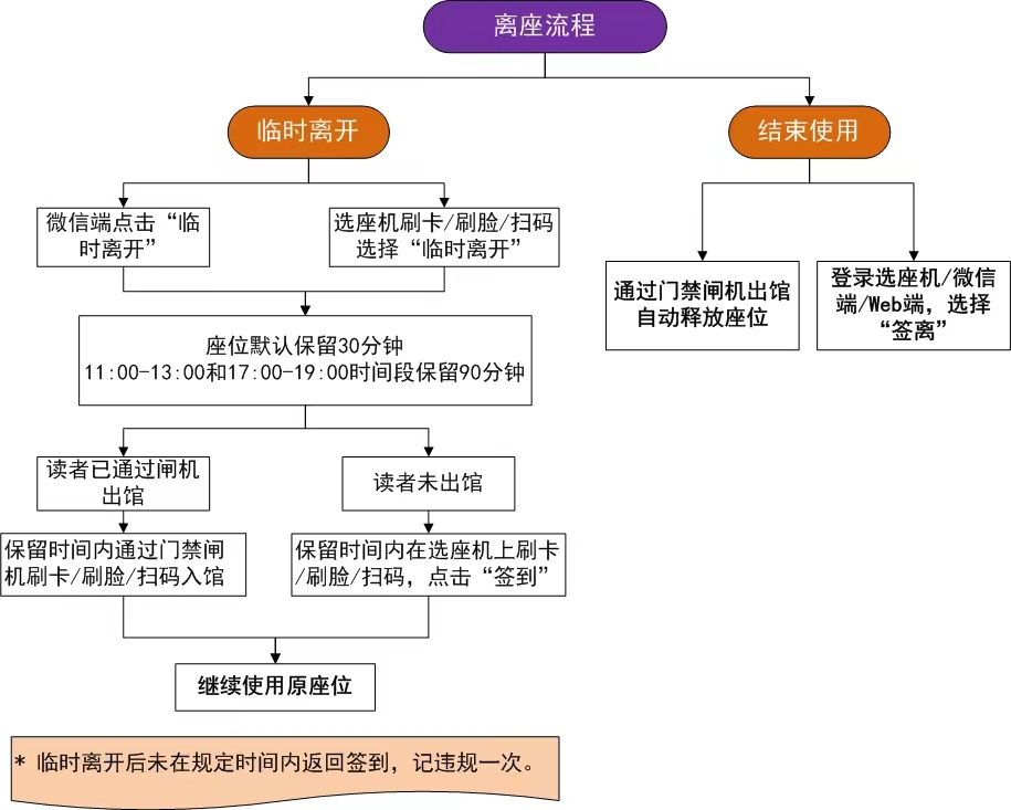 使用座位期间如需临时离开,可在微信端或选座机上办理临时离开手续。