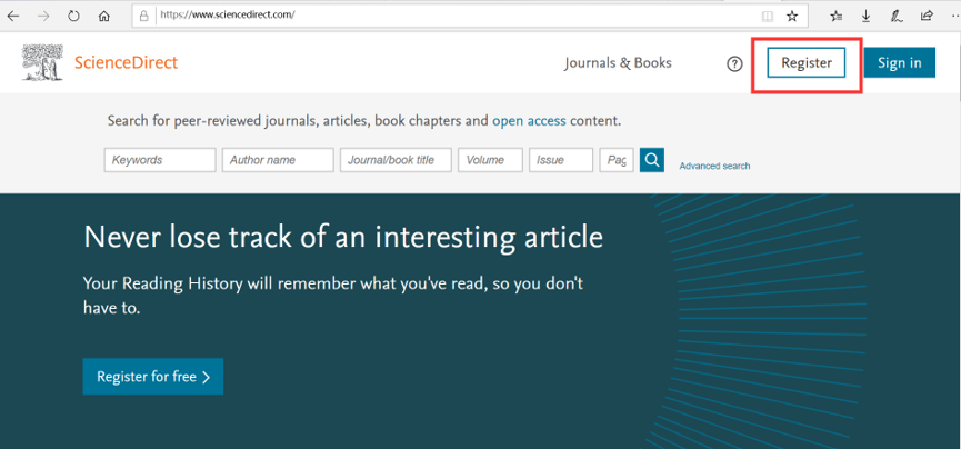 打开ScienceDirect主页点击 http://www.sciencedirect.com 页面右上角“Register”。请用学校邮箱(如:xxxx@xauat.edu.cn) 注册ScienceDirect个人账号。