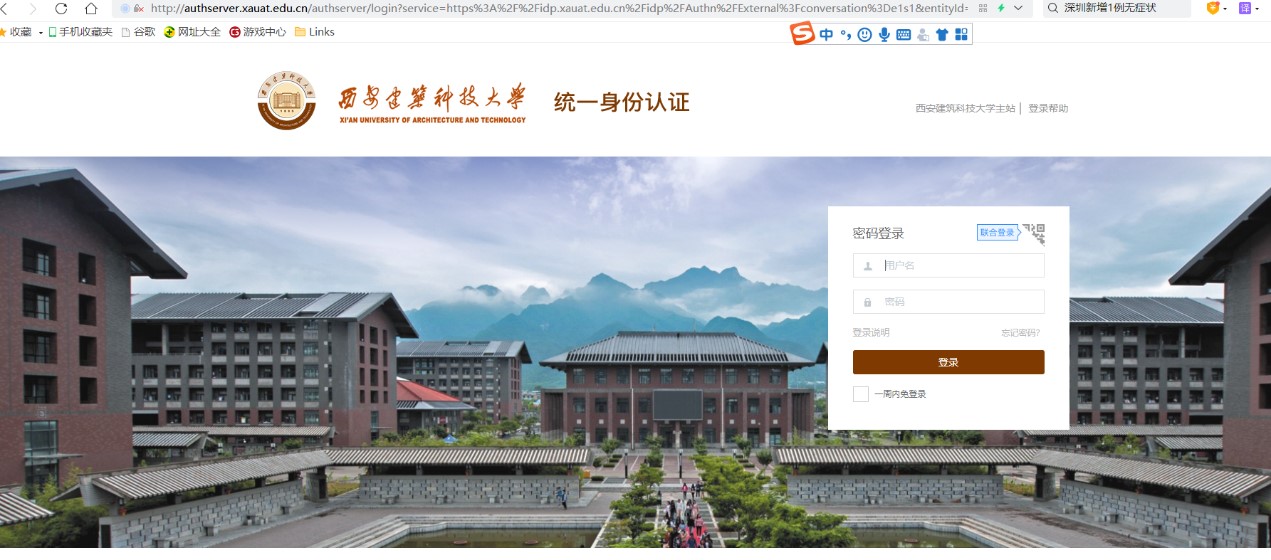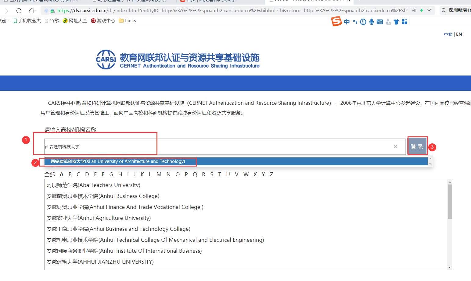 第三步:在出现的界面中,按图示步骤,1)先在搜索框内输入:西安建筑科技大学;2)选中下方出现的“西安建筑科技大学(Xi’an University of Architecture and Technology)”;3)点登录。
