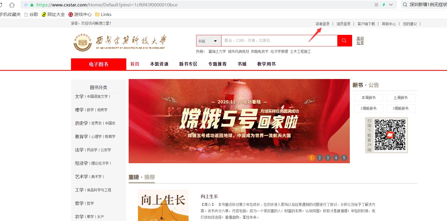 在打开的《畅想之星电子书》主页上点击“读者登录”。