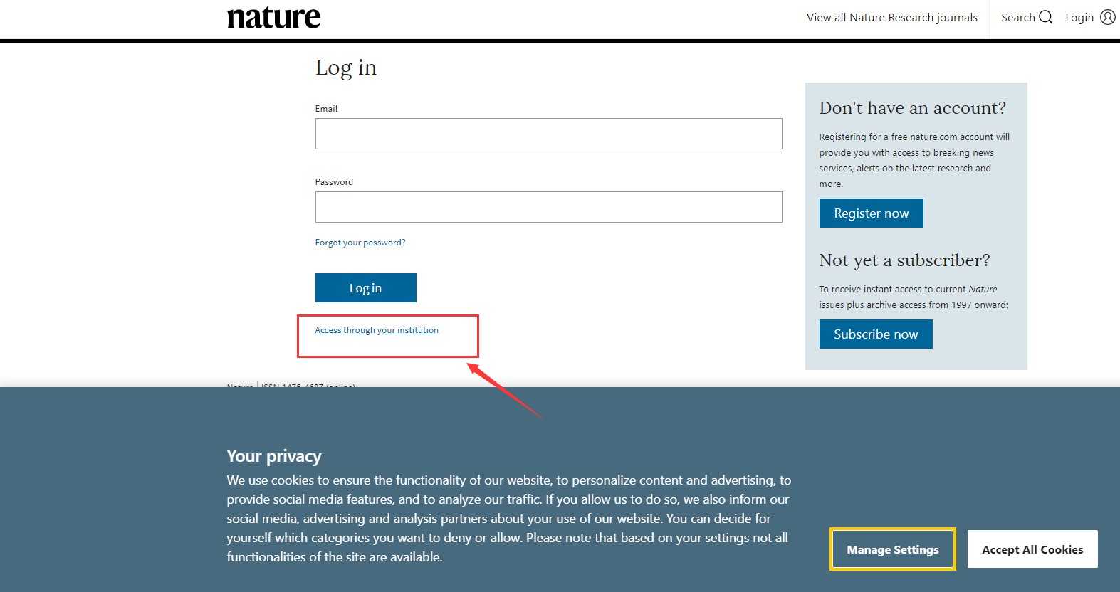 在打开的《Nature》主页上点击“login”。