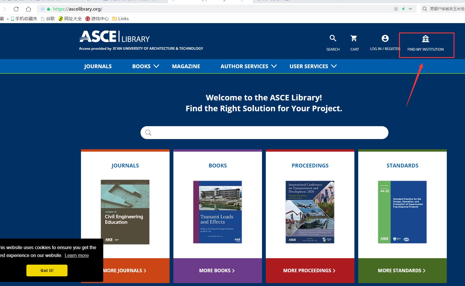 在打开的《ASCE》主页上点击“FIND MY INSTITUTION”。
