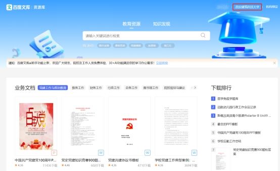 第五步:登录成功后,在百度文库页面右侧上方会显示“西安建筑科技大学”字样,用户即可访问我校购买的百度文库(高校版)数字资源。