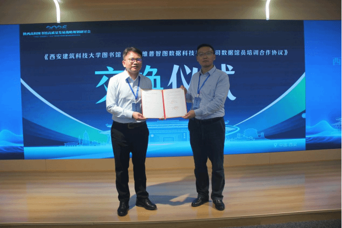 报告环节之后,现场举行了《西安建筑科技大学图书馆、重庆维普智图数据科技有限公司数据馆员培训合作协议》交换仪式。此次合作是高校图书馆与科技企业优势互补的有益尝试,为陕西高校图书馆建设探索出新的路径。