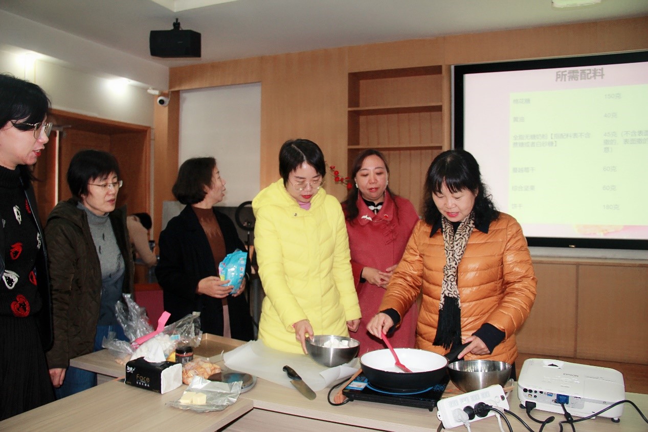 接下来轮到在场女职工上手制作。大家被分成五组,协作完成。大家分工有序,有的炒制棉花糖,有的杂糅棉花糖与坚果、蔓越莓干、饼干,有的定型切块……一小时后,一块块精心制作的雪花酥诞生了。