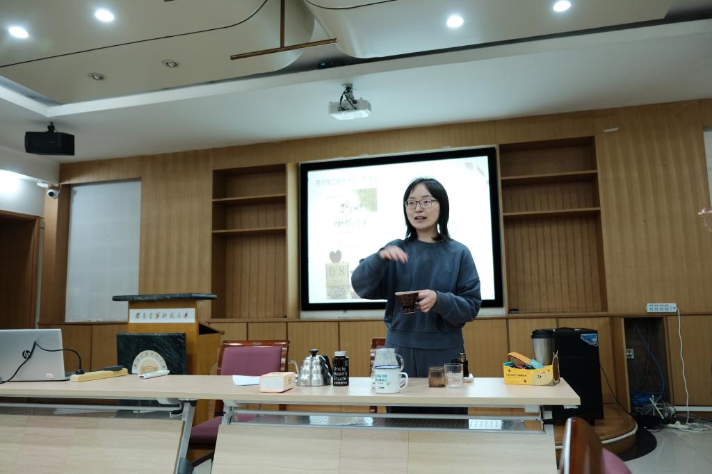 活动现场热闹非凡。第一部分“咖啡学堂”,由图书馆教材部万璞佳结合咖啡的种类、产区以及不同种类咖啡品鉴方法等讲授咖啡文化知识,现场演示手冲咖啡制作过程,带大家领略咖啡文化。随后,现场体验环节,大家亲手制作一杯自己的专属咖啡。浓香醇厚的咖啡味氤氲在图书馆书墨花香中,诉说着时代和时节的美好。